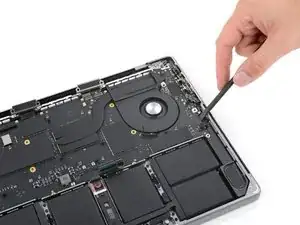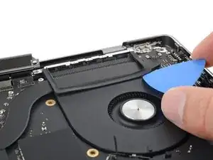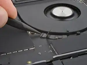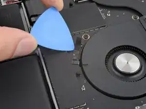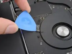 Slide the tip of an opening pick under the fan cable to separate the adhesive securing it to the logic board.