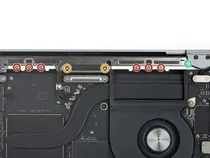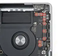 Use your T3 Torx driver to remove the nine 2.1 mm-long 3IP Torx Plus screws securing the four connector covers to the right side of the logic board.