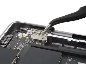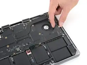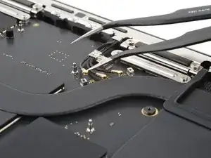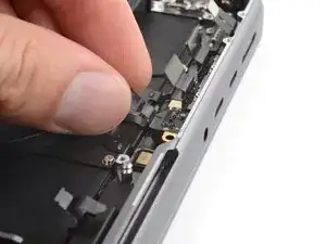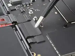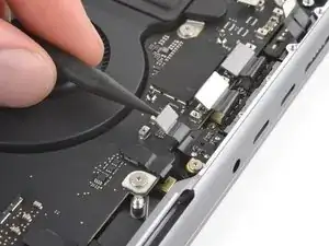 Peel back the tape covering the left speaker ZIF connector on the right side of the logic board.