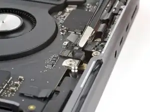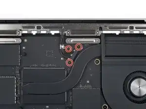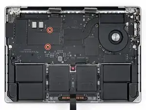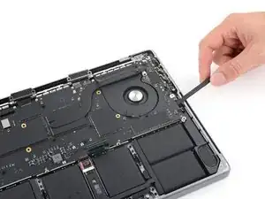 Use your T3 Torx driver to remove the two 3.7 mm-long 3IP Torx Plus screws securing the middle of the logic board.