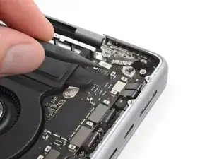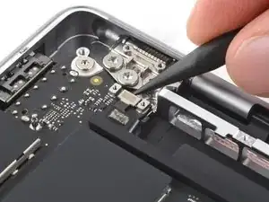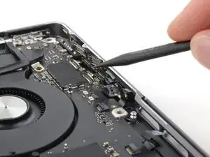 Use the flat end of your spudger to pry up and disconnect the trackpad press connector from the logic board.