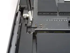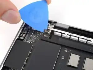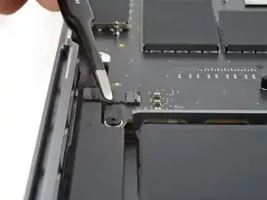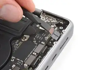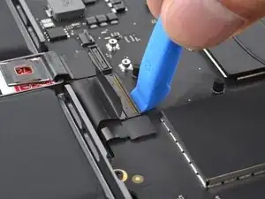Use the point of your spudger to flip up the small locking flap on the logic board battery data ZIF connector.