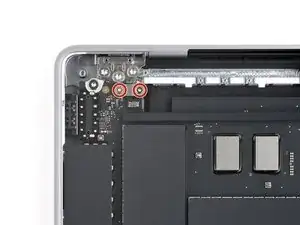 Use a T3 Torx driver to remove the two 2.1 mm-long 3IP Torx Plus screws securing the trackpad connector cover.