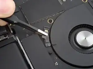 Use tweezers to peel back the tape covering the microphone ZIF connector to the right of the fan.