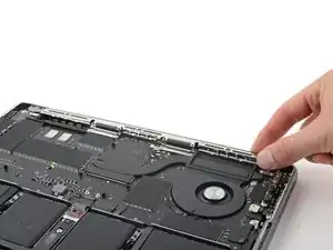 Peel back the tape covering the right speaker ZIF connector on the left side of the logic board.