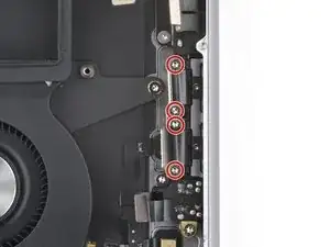 Use your T3 Torx driver to remove the nine 2.1 mm-long 3IP Torx Plus screws securing the four connector covers to the right side of the logic board.