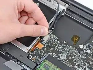 Use the flat end of a spudger to lift the hard drive cable connector up and out of its socket on the logic board.