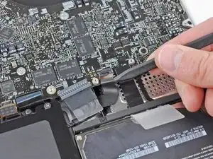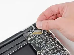 If present, grab the plastic tab attached to the battery connector and pull it toward the front edge of the device. For Late-2011 models the battery connector will not have a tab and is simply a plug that inserts straight down into the motherboard--to remove pry the plug straight up.