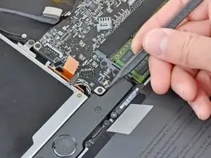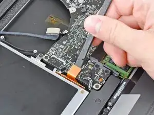 Carefully pull the ports and DC-In board away from the side of the upper case and remove the logic board assembly, minding any cables that may get caught.