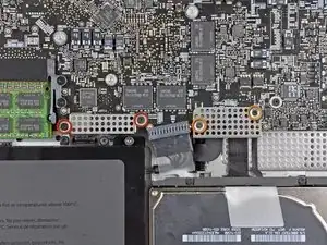Remove the following eight screws securing the logic board and DC-In board to the upper case: