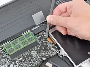 Use the flat end of a spudger to pry the optical drive connector up and out of its socket on the logic board.