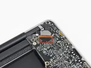 Lift the black plastic flap attached to the display data cable retainer and rotate it toward the DC-In side of the MacBook.