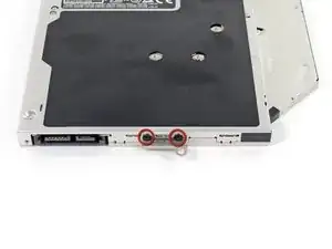 Remove the two black Phillips #0 screws securing the small metal mounting bracket. Transfer this bracket to your new optical drive or hard drive enclosure.