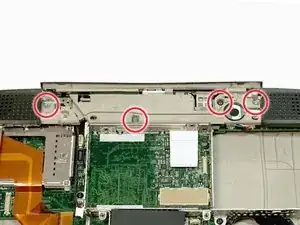 Remove the two silver Phillips #1 screws that attach the heat shield to the internal metal framework.