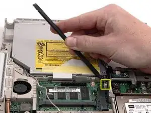 Use a spudger to pry up the Bluetooth antenna from the slot between the optical drive and metal framework.