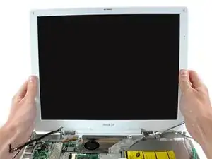 Lift the display up and tilt it backwards, freeing it from the two metal alignment posts holding the hinges in place, and slide it away from you.