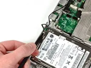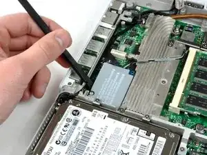 Using a spudger, pry up on the AirPort card from the end nearest the hard drive to separate the connector from the logic board.