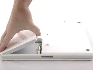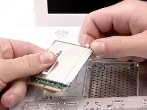 Push the wire clasp away from the AirPort card and toward the display, then rotate up to free it from the RAM shield.
