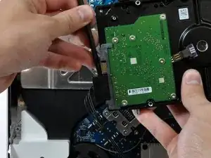 Insert a spudger between the SATA connectors and twist it to separate the connector from the hard drive.