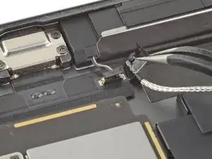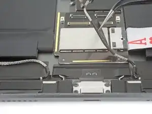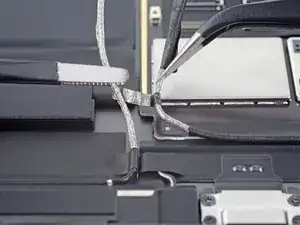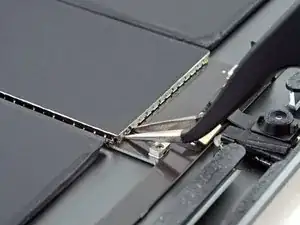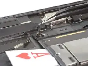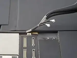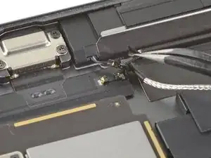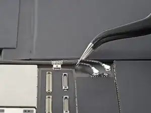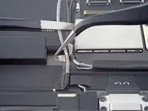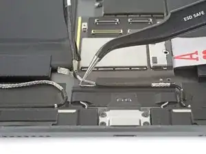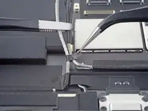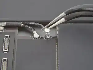 Use a pair of tweezers to disconnect a logic board antenna cable by lifting up on the cable as close to the connector as possible.