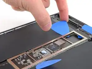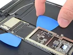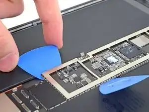 Pry up the logic board until you can slide an opening pick underneath the logic board.