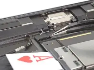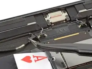 Use a pair of tweezers to peel up the tape covering the right speaker connector.