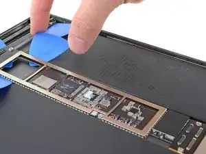 Slide the opening pick down the left edge of the logic board until you get near the Smart Connector cable.