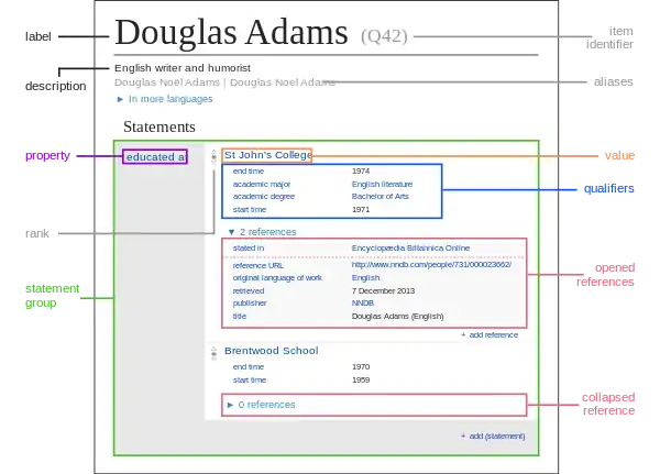 - Many "Statements" about the item that give values for its properties such as "author" and "publication date"