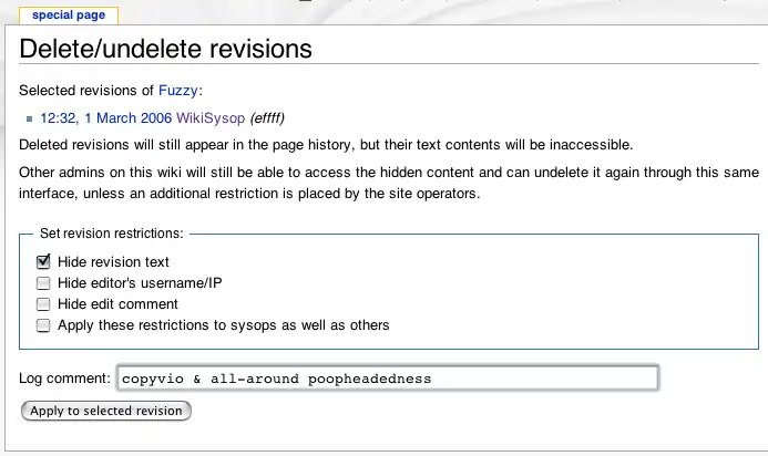 - A canonical example for logged in only: Someone vandalizes an article on a famous person on EnWP to claim he is dead. The next revision reverts, but the trouble maker starts forwarding around the permlink. The general public is too clueless to notice the big "THIS IS AN OLD REVISION" notice at the top. So currently the site is forced to delete that revision to prevent the confusion. Meanwhile people can argue that Wikipedia is covering up the existence of vandalism because of this. ... and many users who would not be confused by the revision lose the ability to see it. Researchers lose the ability to study it, etc. Rev deleting to logged in only would address the issue without the negative side effects. --Gmaxwell 09:14, 16 June 2008 (UTC)