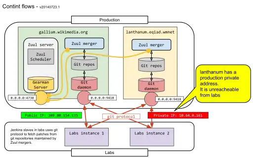 As of July 2014, an ongoing work is being conducted to have a Zuul merger to run on the second server lanthanum.eqiad.wmnet. The flow overview is: