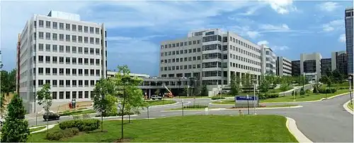 When you get off the train platform, you can see MITRE 4, the building where the event will occur: