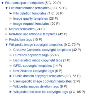 | $5 | Something close to ($1 C, $2 P, $3 F) but with anything that is 0 omitted. More precisely, a comma separated list of the number of pages (mediawiki:categorytree-num-pages), subcategories (mediawiki:categorytree-num-categories), and files (mediawiki:categorytree-num-files) in the category, or empty (mediawiki:categorytree-num-empty) in the case the category has no members. In versions prior to those around 1.19 this value was different. See older version of these docs. |