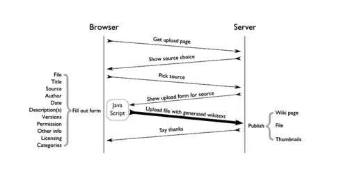 The file is uploaded with an HTML form, along with wikitext for the File: page that will surround the image.