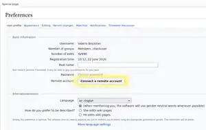 ![]() The page Special:Preferences with WSOAuth installed showing the "Connect a remote account" button |