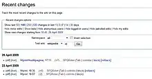 The recent changes special page is adapted to display the edits in the test wiki of your preference. "None/All" returns the normal display, and "Incubator" displays all edits that are not made in a test wiki. You can select the project and enter a language code to view the recent changes of a specific test wiki, or you can use &testwiki=wx/xyz in the URL.