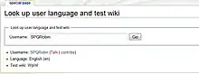 - A special page "Special:ViewUserLang" to view the language and test wiki preference of a user