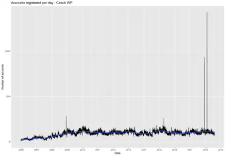 In Figures 3 and 4, we see the spikes in account creations, which we need to look into. Secondly, we can start to see some amount of seasonal variation in registrations on Czech Wikipedia, there's a dip during the summer months in both 2017 and 2018.