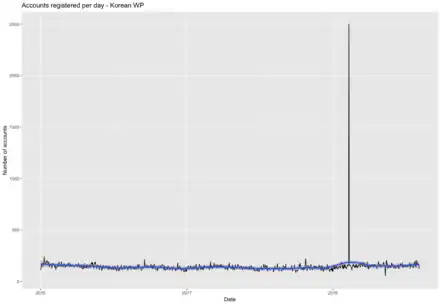 There are some trends to note in Figures 1 and 2. First of all, we have some days with very high number of accounts registered, and some of these happened recently (within the last year). We will look into how these accounts were created in case they affect our calculations. Secondly, we can see that the number of new accounts has been fairly stable since about 2011 for both wikis. There is some fluctuation, which we will come back to. Lastly, we can see the effect of the SUL finalization project during 2014 and 2015, leading to a significant increase in the number of account creations during that time period.