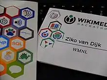 - the special Wikimedia Hackathon logo with location and year (e.g. Wikimedia Hackathon 2018 Barcelona)