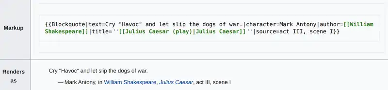 The Blockquote template provides formatting for block quotations, and includes preformatted attribution parameters for a quote's author and source.
