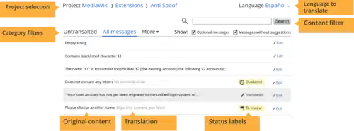 - Existing codebase. Translate, where the developments of this project will concentrate, is a mature extension. It's been developed for many years and contains many lines of code, mostly in PHP. Unlike in the ULS, we are not starting from scratch and there are many limitations set by the existing design, as well as by MediaWiki. Some of them we can fix or work around, some of them not. This project will stress-test the internal interfaces.