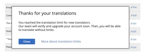 - Present translation limit in a positive way. The message emphasizes the fact the user is evolving from a new translator to a more experienced one.