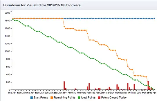 During FY2015Q3, the Foundation-wide focus on VE meant the team received both additional support and greater demands for reporting to senior management. The team leadership began doing detailed estimation via story pointing and burnup charting, writing weekly status reports, and leading large weekly status meetings. After the end of the quarter, the support ended and half of the engineers and QA were reorganized out of the team, but the reporting burden has not decreased.