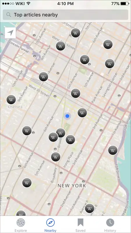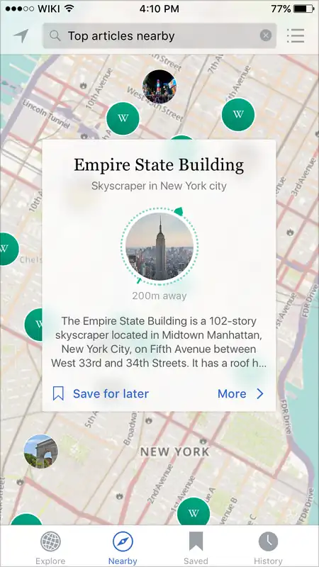 Show the top X number of articles nearby as pins in a full-screen map view, with a single pin highlighted showing a ‘card’ previewing a single article.