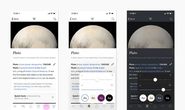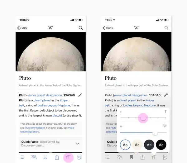 You can adjust the article text size using the Text Size tool from any article's toolbar. This setting affects the size of the text in articles, previews and summaries. To adjust the size of the user interface elements (like buttons) you can use iOS’s Dynamic Text setting, which will adjust the size of interface text across your device, including on Wikipedia.