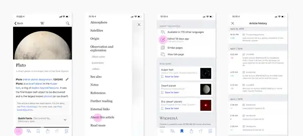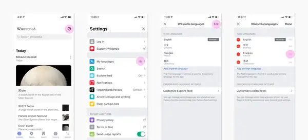 Both apps present information from various languages in a card-based feed we call Explore. This is because mobile apps do not present content on small phones in the "web page template" style that websites do. So we take the content from those main pages that volunteers own and create, and we present that as cards in an easily scrollable and customizable feed.