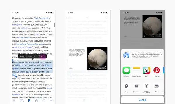 To use the Share-a-Fact option, select the quote or fact text you want to share. Then long press the selected text and choose Share from the popover menu. The Share-a-Fact preview will show you how your image will look.