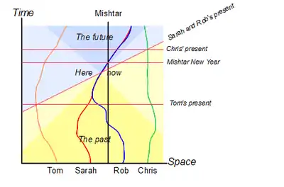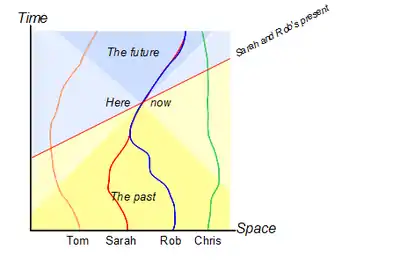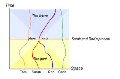 The 'present' is a line which moves inexorably up the diagram gradually turning 'future' events (coloured blue) in to 'past' events (coloured yellow). Four characters in this simple universe are represented by 'world lines' which snake their way up the diagram. For Sarah and Rob, the point labelled 'Here/Now' appears to have special significance.