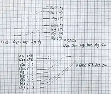 To compose a Molecular Diagram of a molecule with D4h symmetry group, we should first find the irreducible representation of the ligands and of the center molecule. and then find the SALCS for each of the irreducible representation and finally, compose the molecular diagram. To take an easy example, the Square Planar Complexes.. starting with the sigma orbital of the ligands, the reducible representation of the sigma orbital is the total number of atoms that do not move under each operation. For the Pi orbital, we have to degenerate the pi orbital has two degrees of freedom, thus, the reducible representation of the pi orbital can also be found by using the similar method. and then, by using the projection operation method, we can find the irreducible representations of the ligand's sigma and pi orbital. In this case, the sigma orbital has A1g, B1g, Eu three irreducible representations and the pi orbital has A2g, A2u, B2g, B2u, Eg and Eu.