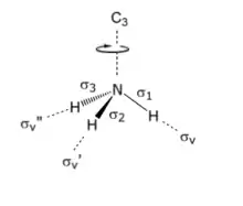 The symmetry elements of NH3 are E, 2C3, and 3 sigma-v. To elaborate, the molecule is of C3v symmetry with a C3 principal axis of rotation and 3 vertical planes of symmetry. The image of the ammonia molecule (NH3) is depicted in Figure 1 and the following character table is displayed below [2]: